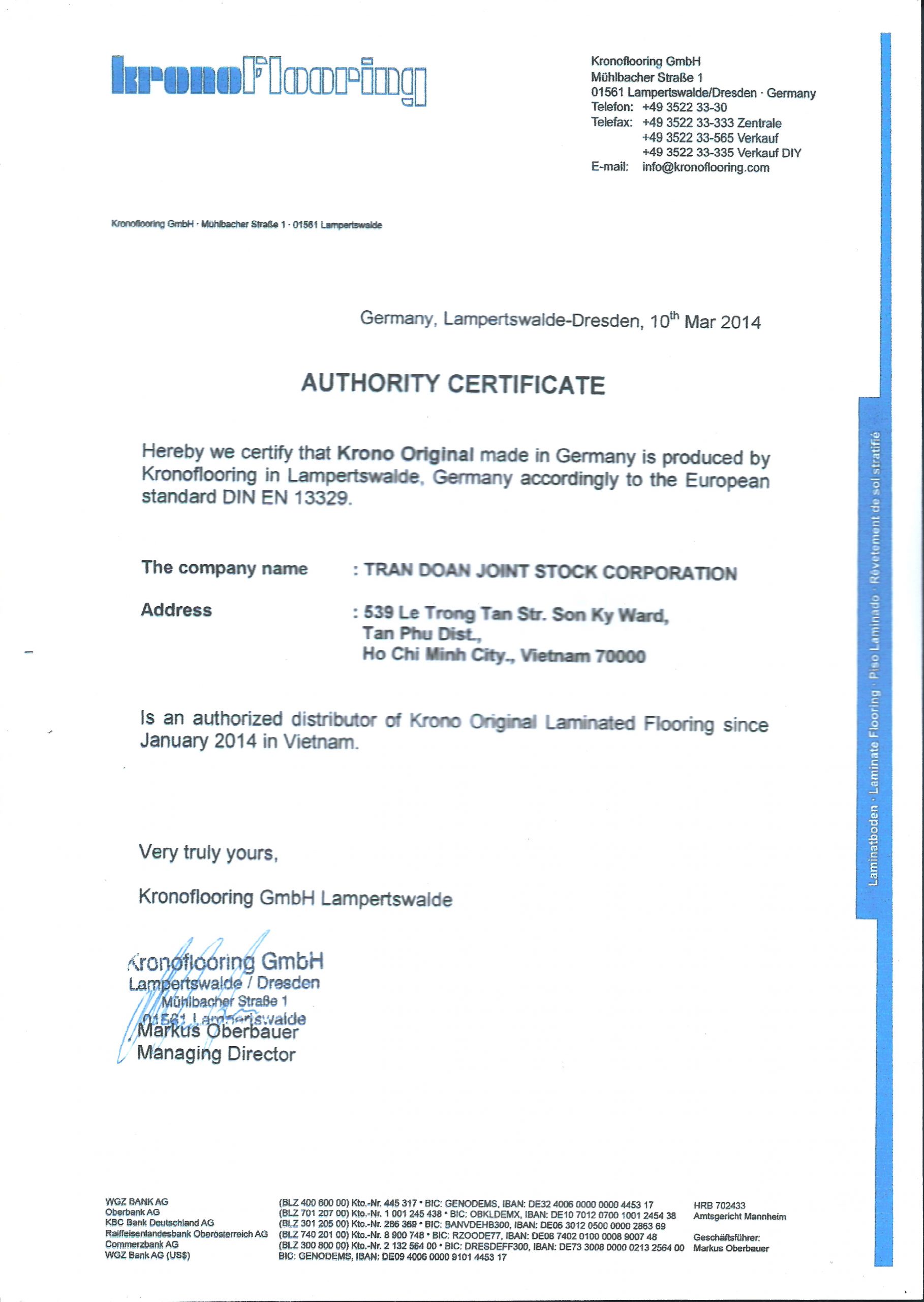 Được cấp giấy chứng nhận theo tiêu chuẩn chất lượng Châu Âu: EN 13329 – là tiêu chuẩn khắt khe nhất về đo lường và kiểm tra chất lượng sàn gỗ trên toàn thế giới.